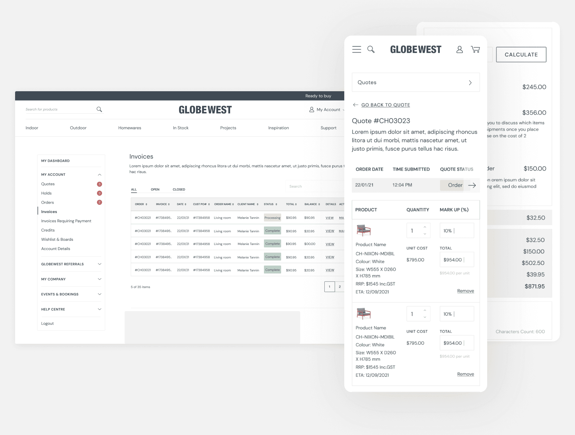 Create quotes, calculate shipping and installation, and include and see profit margin for products.