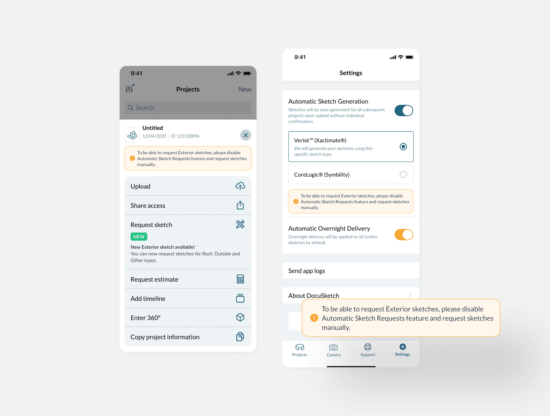 Before submitting a tour in the menu, users were informed that sketch generation would be triggered automatically. While they were already aware of this process, they were also notified that, as a result, exterior sketch options would no longer be available in the future.