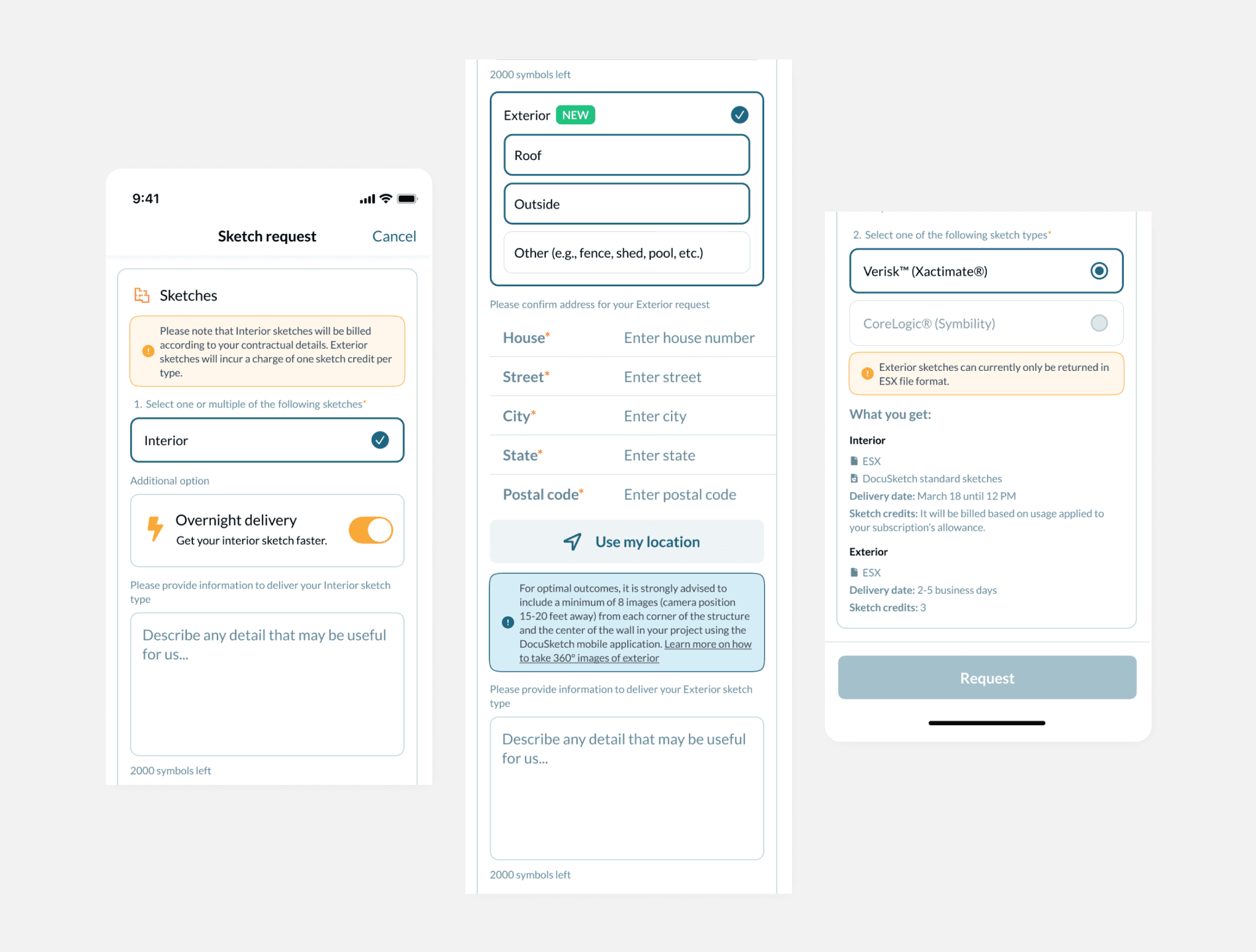 Redesigned the sketch request form to include exterior sketches, catering to web, iOS, and Android platforms